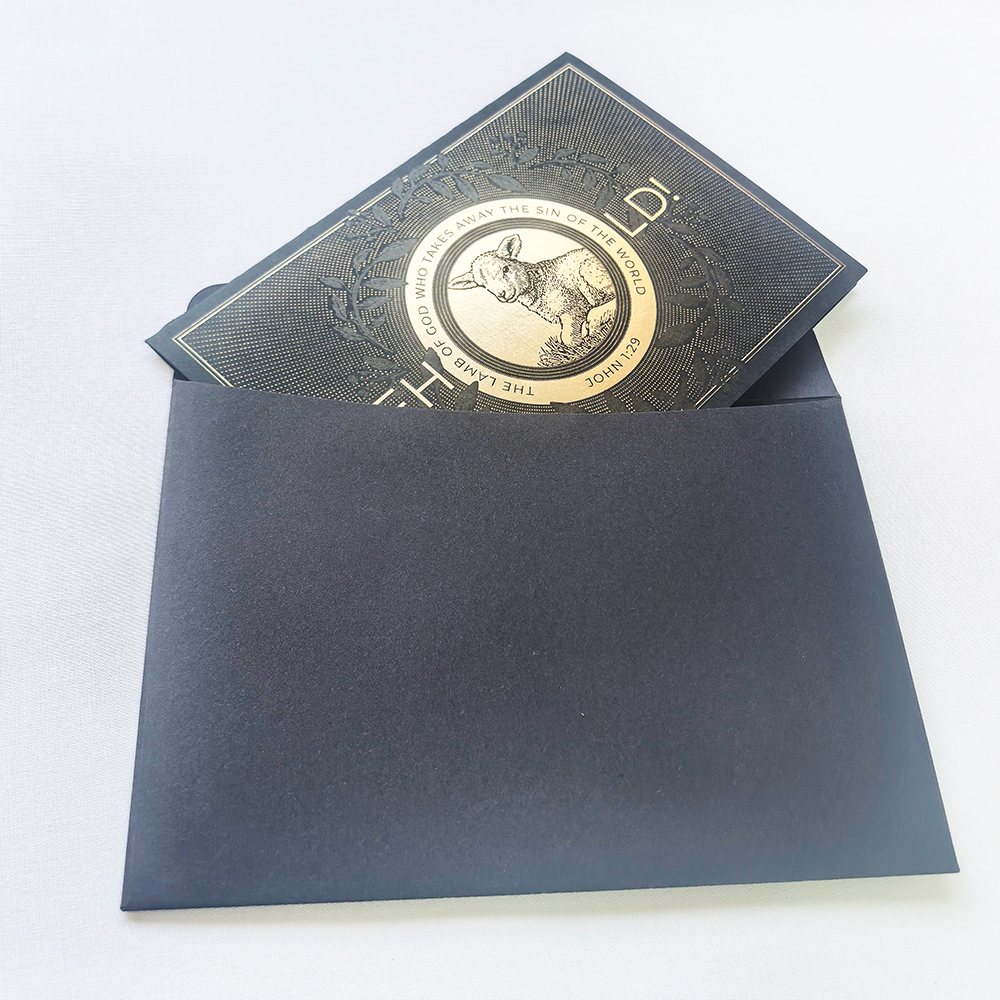 carte de remerciement Taille: 100x140mm cartes par jeu : 10 cartes par enveloppe Papier : papier cartonné 350 g/m²/C1S, impression : couleur sur un côté, dos de couleur noire, estampage à l'aluminium