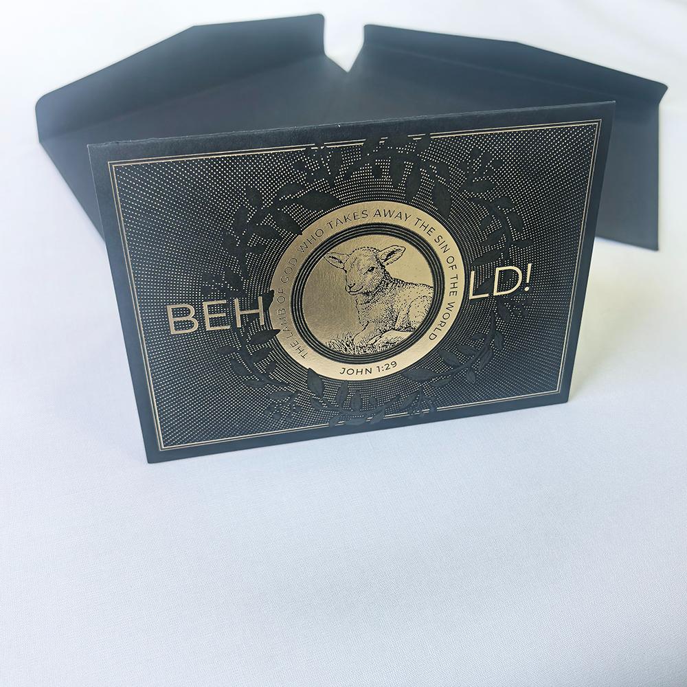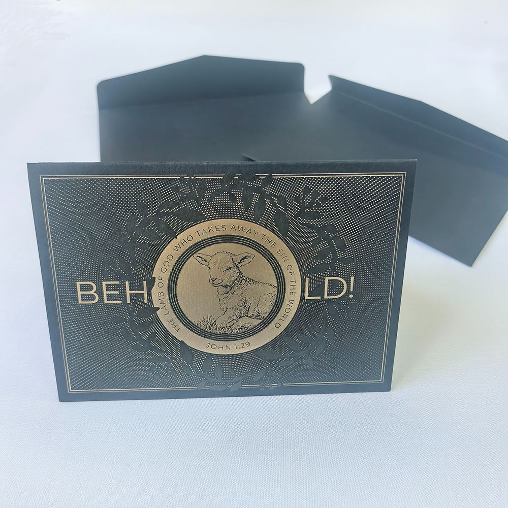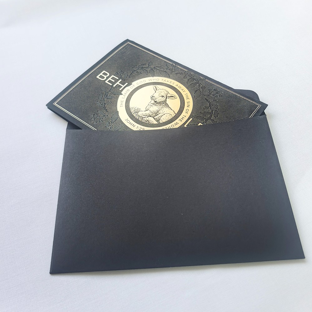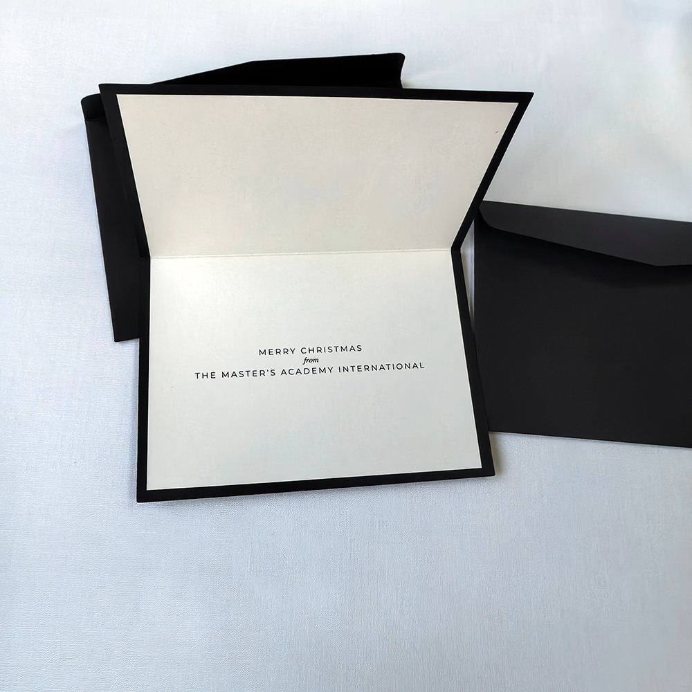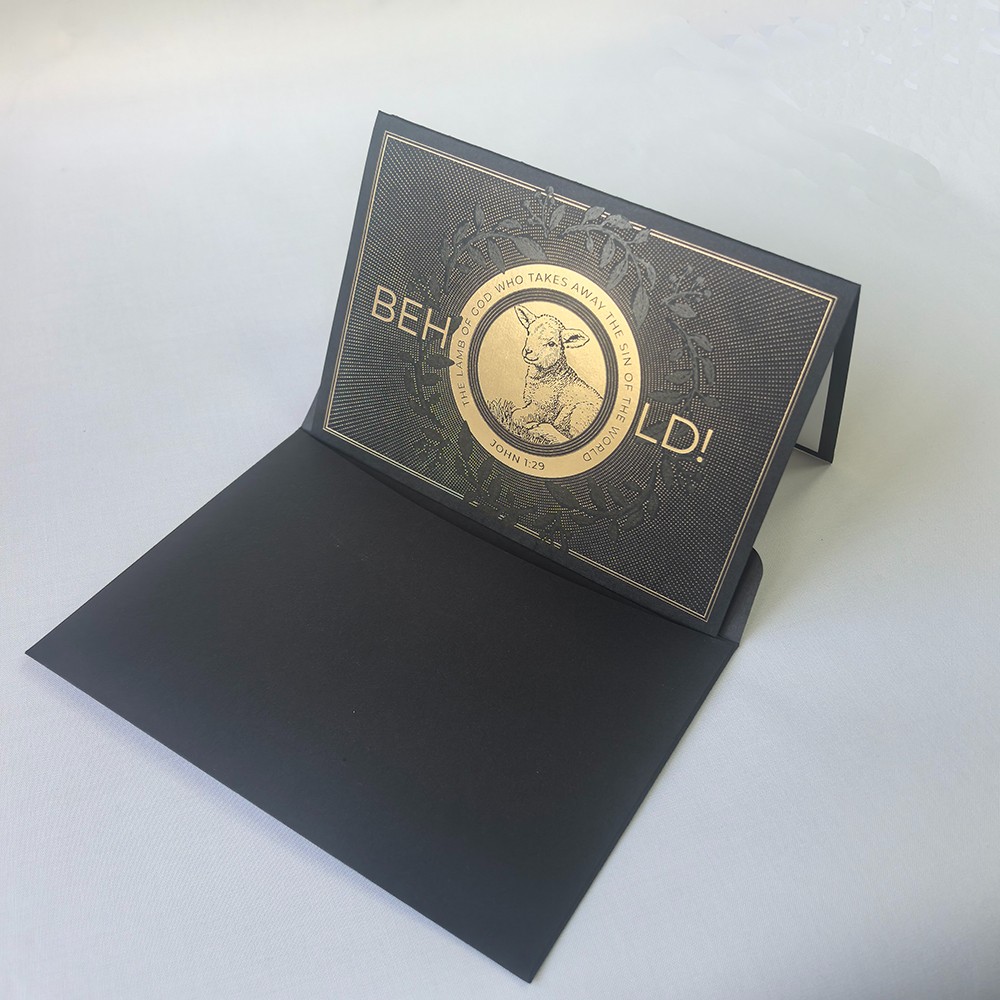 Sunnywell Printing est un fournisseur direct d'usine de cartes de Noël, la carte de Noël est une carte de couleur noir/vert, pliée en deux, la surface est estampée et gravée, et le logo d'impression UV. La carte que nous avons utilisée est un matériau épais de certification FSC.