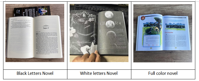 Normalement, le nouveau livre utilisant la couleur B&W, les lettres noires avec du papier blanc, cette impression de type économise et normale, si vous souhaitez utiliser du papier noir avec des lettres blanches, l'impression doit être prudente, l'encre noire est trop grande et facile à avoir un problème dans l'impression. Le livre de roman en couleur est très cher dans l'impression, nous pouvons mettre des pages en couleur dans la commande de pages spéciales si besoin de sauvegarder la partie d'impression.