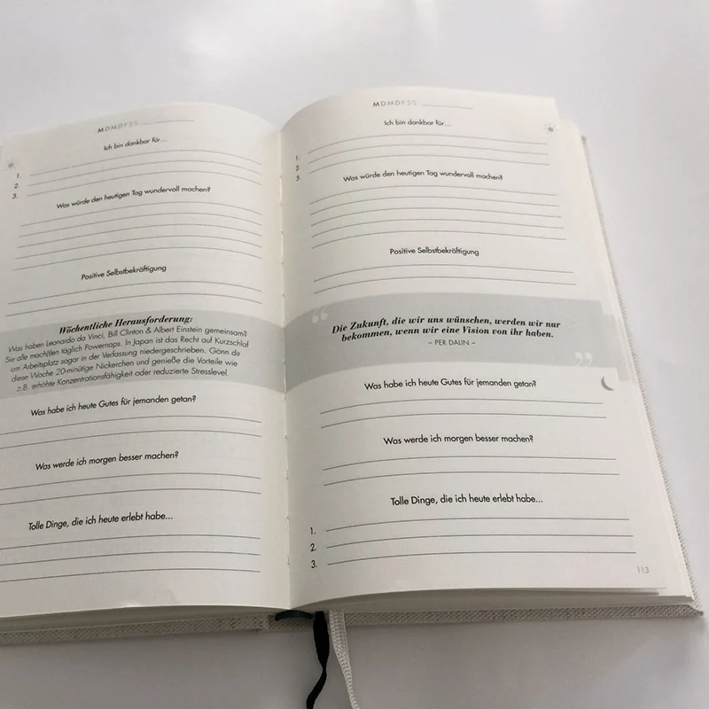Le carnet de notes de planificateur de journal d'impression conçu par le client utilise des fichiers d'illustrations de clients pour l'impression et la reliure des pages intérieures. La couverture peut être en cuir, en lin ou en couverture rigide imprimée sur demande. Un livre d'échantillons est disponible avant les productions de masse. Le MOQ est de 200 pièces. Le journal de notes personnalisé imprimé Sunnywell a de bonnes critiques et commentaires. En cas de problème de qualité, nous rembourserons ou refabriquerons les livres. Bienvenue à nous contacter pour vos planificateurs.